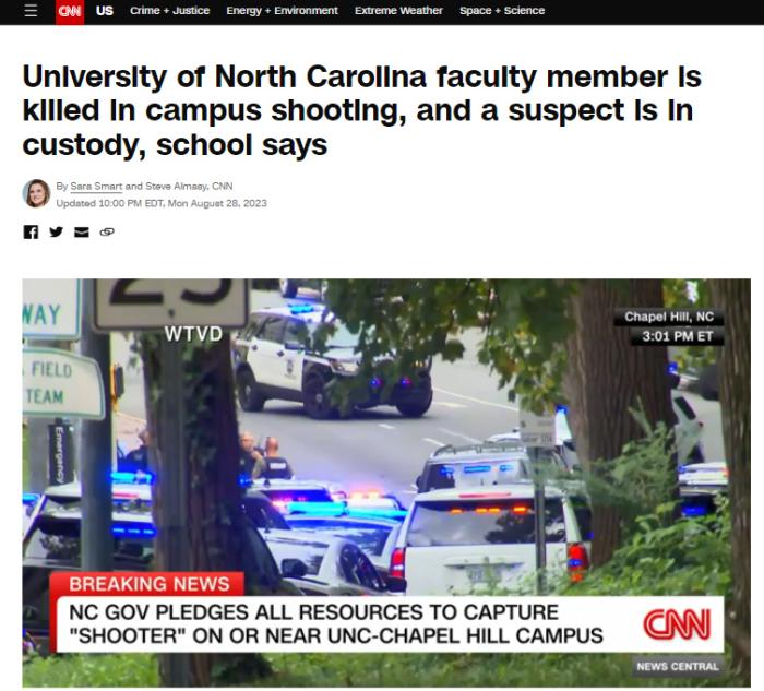 中新網8月29日電 綜合美媒報道,當地時間28日,美國北卡羅來納大學教堂山分校發生一起槍擊事件,造成該校一名教職人員死亡。