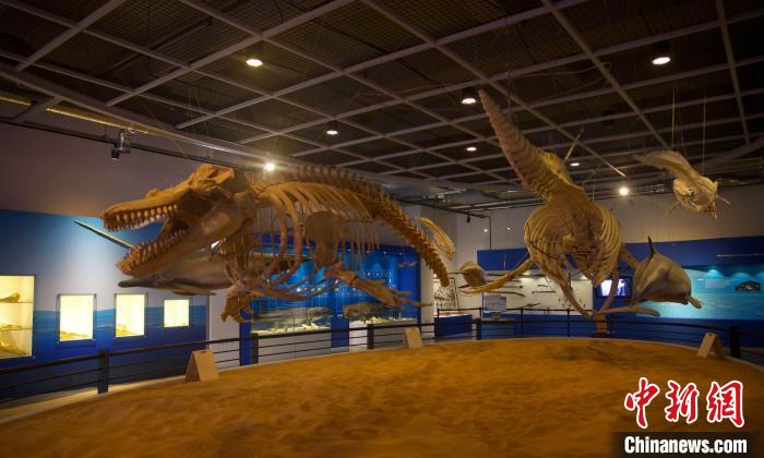 圖為(wei) 蔚山長生浦鯨魚博物館展出的實物鯨魚骨骼。 中新社發王悅攝