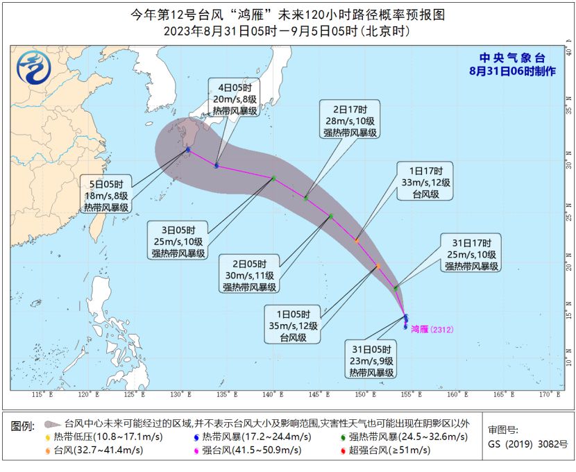 今年第12號台風“鴻雁”(KIROGI;名字來源:朝鮮;名稱意義(yi) :一種候鳥,大雁)於(yu) 昨天(30日)晚上在西北太平洋洋麵生成,其中心今天(31日)早晨5點鍾位於(yu) 美國關(guan) 島偏東(dong) 方向約1030公裏的西北太平洋洋麵上,就是北緯14.4度、東(dong) 經154.3度,中心附近最大風力有9級(23米/秒),中心最低氣壓為(wei) 990百帕,七級風圈半徑100-250公裏。
