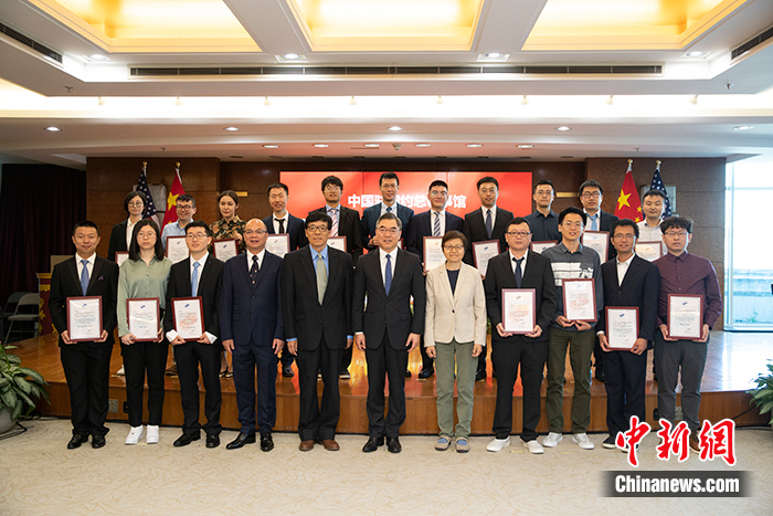 圖為(wei) 中國駐紐約總領事黃屏(前排中)、紐約州立大學布法羅分校終身教授張傑(前排左五)、負責教育事務的參讚餘(yu) 有根(前排左四)等與(yu) 獲獎學生合影。 中新社記者 廖攀 攝