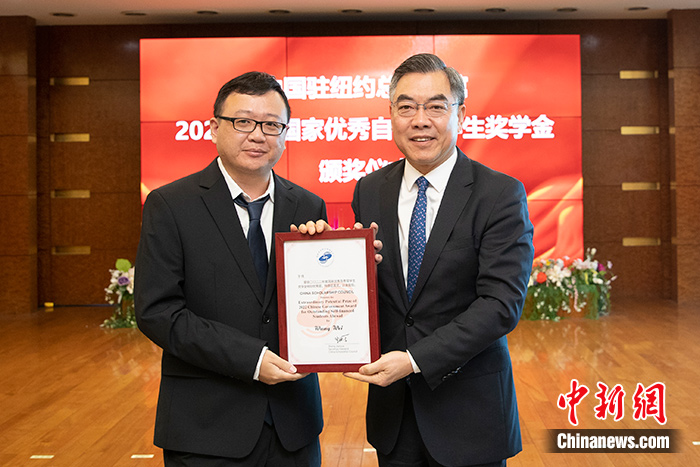 中新社紐約9月2日電 (記者 廖攀)中國駐紐約總領事館2日在紐約駐地舉(ju) 行2022年度國家優(you) 秀自費留學生獎學金頒獎儀(yi) 式,中國駐紐約總領事黃屏為(wei) 獲獎學生頒獎,負責教育事務的參讚餘(yu) 有根介紹紐約領區獲獎情況。獲獎學生、評審專(zhuan) 家代表等近90人通過線上線下結合方式出席頒獎儀(yi) 式。