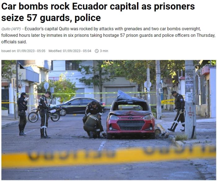 報道稱,截至目前,共有7名警察和50名監獄看守被囚犯扣押在6所監獄中。聲明指出,此次騷亂(luan) 可能與(yu) 厄瓜多爾當局日前對一所監獄展開的搜查行動有關(guan) 。