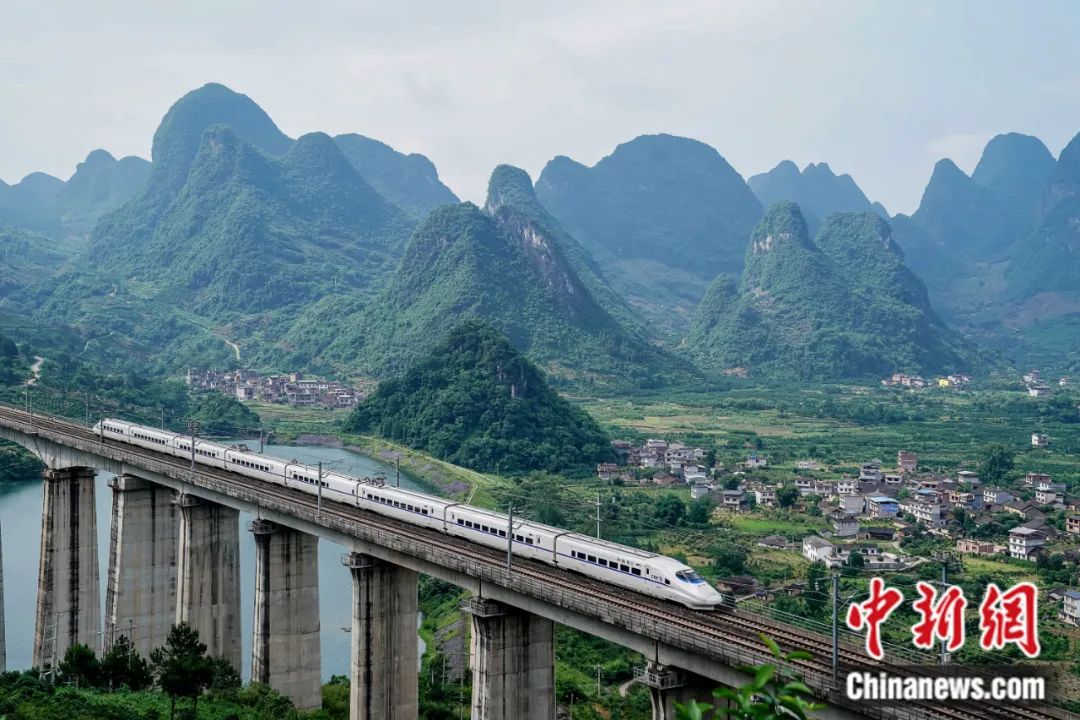 2019年5月,一列動車穿越位於(yu) 廣西陽朔縣興(xing) 坪鎮內(nei) 的幸福源特大橋。陳冠言 攝