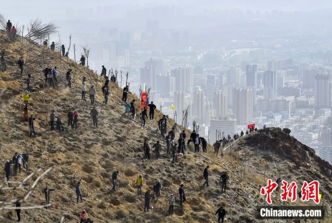 2019年4月,新疆烏(wu) 魯木齊市沙依巴克區,民眾(zhong) 在雅瑪裏克山青年峰下種植樹木。劉新 攝