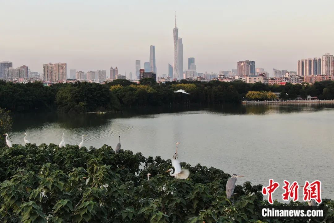 2021年11月,白鷺、蒼鷺等鳥類在廣東(dong) 省廣州市的海珠湖鳥島上停歇。陳楚紅 攝