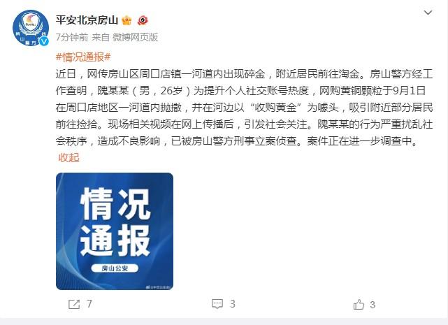 中新網9月3日電 3日,北京市公安局房山分局官方微博發布情況通報稱,近日,網傳(chuan) 房山區周口店鎮一河道內(nei) 出現碎金,附近居民前往淘金。房山警方經工作查明,隗某某(男,26歲)為(wei) 提升個(ge) 人社交賬號熱度,網購黃銅顆粒於(yu) 9月1日在周口店地區一河道內(nei) 拋撒,並在河邊以“收購黃金”為(wei) 噱頭,吸引附近部分居民前往撿拾。現場相關(guan) 視頻在網上傳(chuan) 播後,引發社會(hui) 關(guan) 注。隗某某的行為(wei) 嚴(yan) 重擾亂(luan) 社會(hui) 秩序,造成不良影響,已被房山警方刑事立案偵(zhen) 查。案件正在進一步調查中。