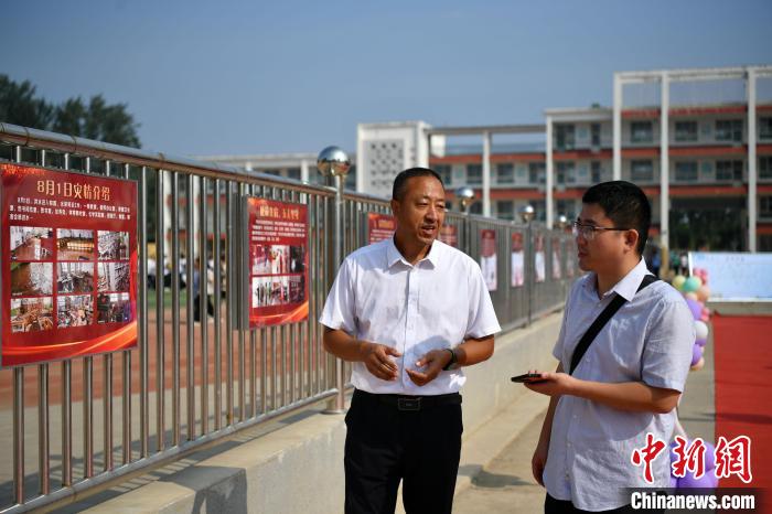 9月1日,涿州市刁窩中學校長孫常見(左)向中新社記者講述“築夢路”背後的故事。 中新社記者 翟羽佳 攝