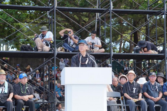 2016年6月19日,在日本衝(chong) 繩縣首府那霸市一座公園內(nei) ,時任衝(chong) 繩縣知事翁長雄誌(前)發表講話。新華社記者沈紅輝攝