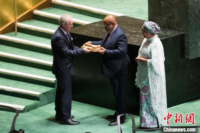 當地時間9月5日,第77屆聯合國大會(hui) 在紐約聯合國總部閉幕。在聯合國常務副秘書(shu) 長阿明娜(右)的見證下,第77屆聯大主席克勒希(左一)將象征聯大主席權力的議事槌交給第78屆聯大主席弗朗西斯(中)。中新社記者 廖攀 攝