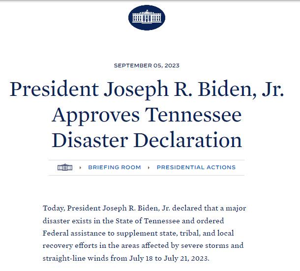 中新網9月6日電 據白宮官網消息,當地時間9月5日,美國總統拜登批準田納西州重大災難聲明,並下令為(wei) 田納西州從(cong) 7月18日開始至7月21日期間受風暴影響的地區提供聯邦援助。