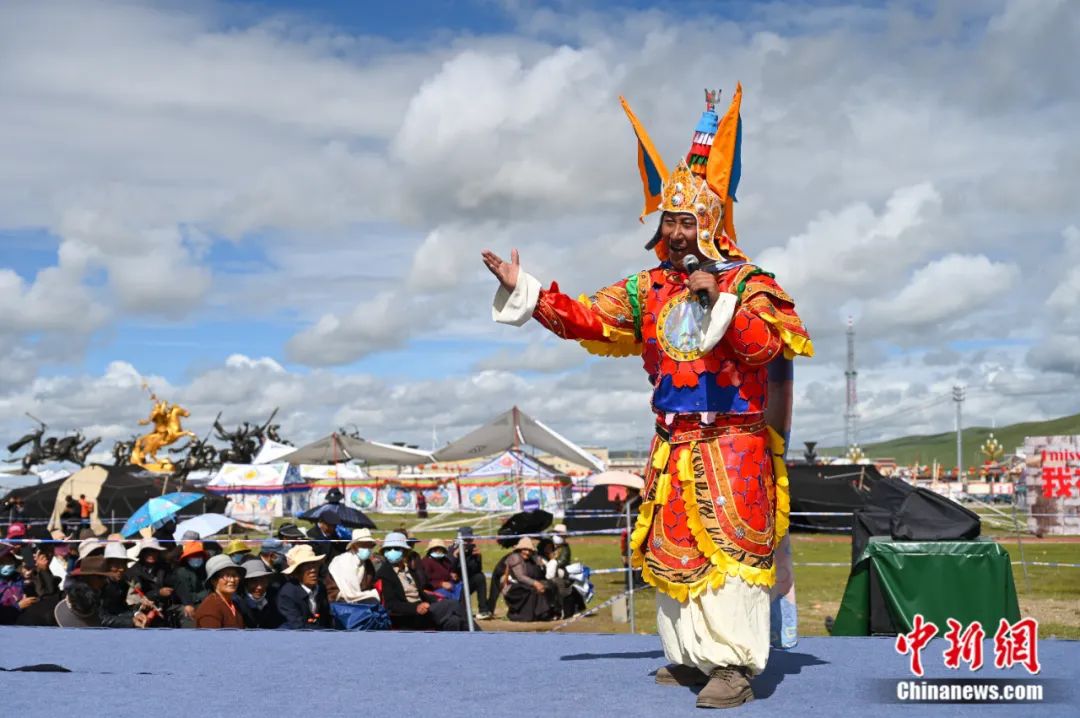 2023年8月9日,那曲賽馬節上,格薩爾說唱藝人登台演出。趙朗 攝