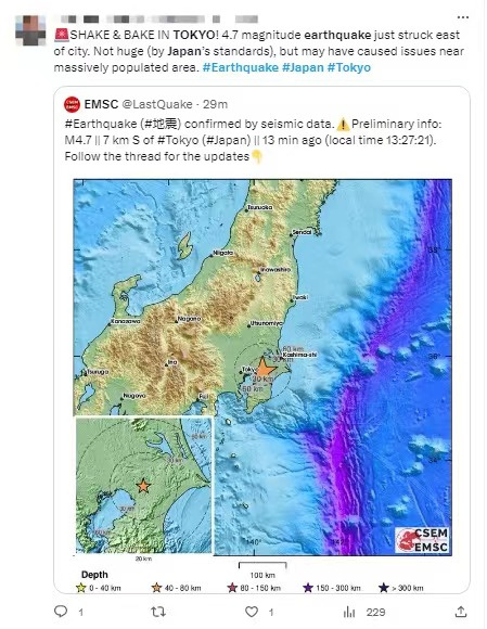報道稱,當地時間5日下午1點27分(北京時間中午12點27分)左右,日本千葉縣西北部發生4.5級地震,最大震度為(wei) 3,震源深度70公裏。