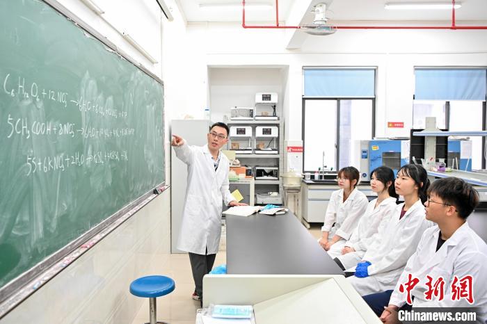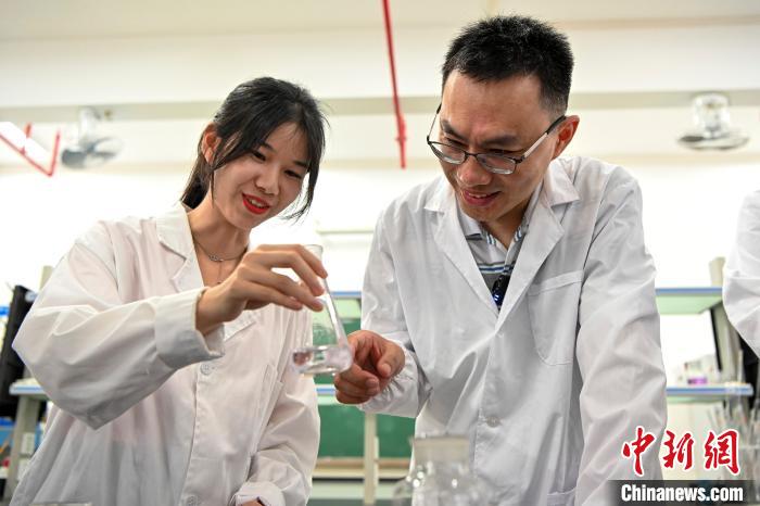 今年6月底,台灣教師黃崇輔(右)在肇慶學院指導學生做實驗。中新社記者 陳驥旻 攝