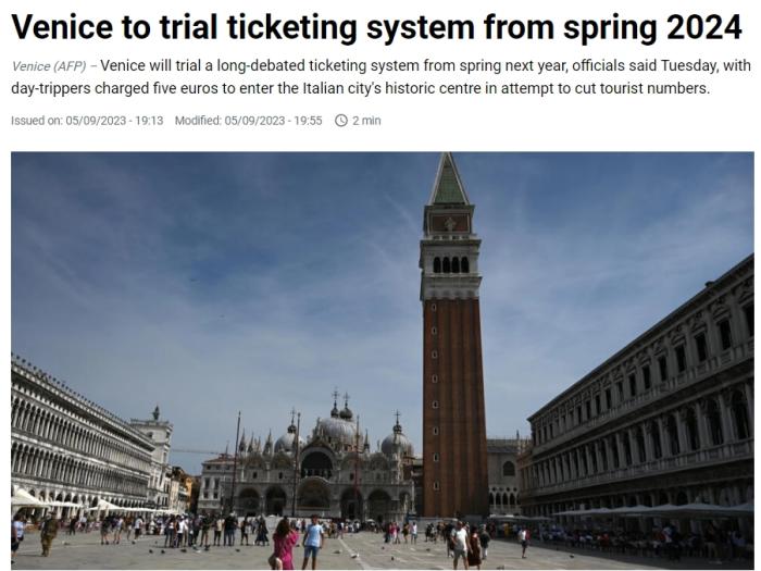 中新網9月6日電 據法新社報道,當地時間5日,意大利威尼斯市議會(hui) 官員表示,威尼斯2024年春起將試行對一日行遊客收取5歐元(約合人民幣39.2元)費用。官員表示,此舉(ju) 意在減少遊客人數。