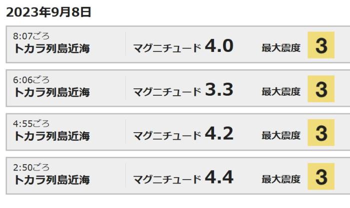 據報道,4次地震的震級分別為(wei) 4.4級、4.2級、3.3級和4.0級,震中都位於(yu) 鹿兒(er) 島縣吐噶喇列島附近,附近的土島村有明顯震感。
