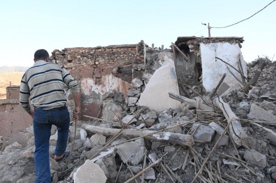 9月9日,在摩洛哥馬拉喀什附近,居民查看遭地震損毀的建築。新華社發(艾薩攝)