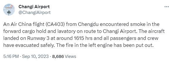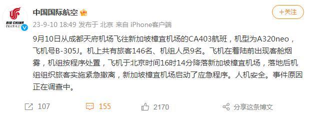 另據中國國際航空官方微博消息,10日從(cong) 成都天府機場飛往新加坡樟宜機場的CA403航班在著陸前出現客艙煙霧,機組按程序處置,飛機於(yu) 北京時間16時14分降落新加坡樟宜機場,落地後機組組織旅客實施緊急撤離,新加坡樟宜機場啟動了應急程序。人機安全。事件原因正在調查中。