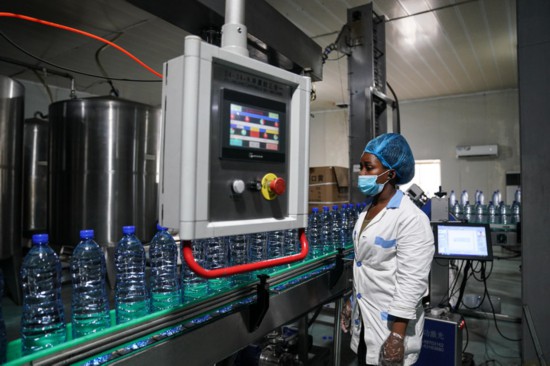 9月9日,當地員工在位於(yu) 加蓬首都利伯維爾的歐來源純淨水廠生產(chan) 線上工作。新華社記者韓旭攝