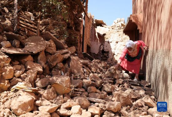9月11日,在摩洛哥馬拉喀什南部的穆萊村,一名婦女走過地震廢墟。新華社記者王東(dong) 震攝