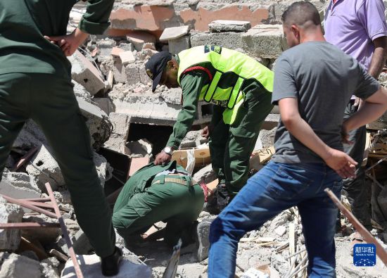 9月11日,救援人員在摩洛哥馬拉喀什南部的艾米茲(zi) 米茲(zi) 村地震廢墟上搜救。新華社記者王東(dong) 震攝