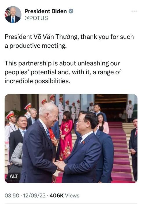 在這條發布在美國總統官方賬號上的帖子裏,拜登為(wei) “富有成效的會(hui) 議”向武文賞(Vo Van Thuong)表示感謝。然而,配發的圖片中並沒有出現武文賞,而是放了拜登和越南國會(hui) 主席王庭惠(Vuong Dinh Hue)握手的照片。這條帖子目前已被刪除。