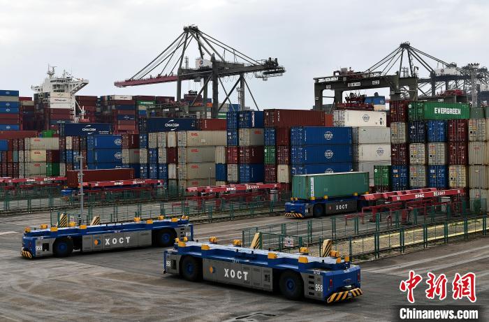 9月7日,廈門遠海自動化碼頭上,轉運集裝箱的自動導引車正在作業(ye) 。這是全球首個(ge) 第四代自動化碼頭、中國首個(ge) 擁有全部自主知識產(chan) 權的自動化碼頭,開行了多條“絲(si) 路海運”命名航線。 中新社記者 張斌 攝
