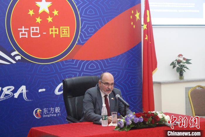 古巴駐華大使白詩德在古巴駐華大使館13日舉(ju) 行的媒體(ti) 見麵會(hui) 上發言。 蘇婧欣 攝