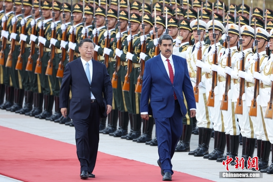 9月13日下午,中國國家主席習(xi) 近平在北京人民大會(hui) 堂同來華進行國事訪問的委內(nei) 瑞拉總統馬杜羅舉(ju) 行會(hui) 談。會(hui) 談前,習(xi) 近平在人民大會(hui) 堂東(dong) 門外廣場為(wei) 馬杜羅舉(ju) 行歡迎儀(yi) 式。中新社記者 盛佳鵬 攝