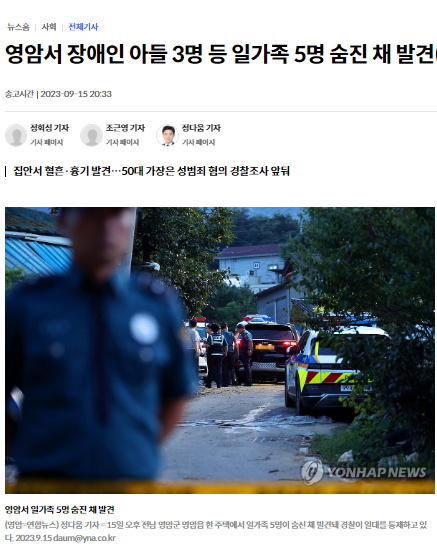 中新網9月15日電 據韓聯社報道,當地時間15日下午,韓國全羅南道靈岩郡一家五口在家中同時身亡,現場到處都是血跡。