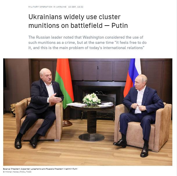 中新網9月15日電 據塔斯社報道,當地時間15日,俄羅斯總統普京在索契會(hui) 見白俄羅斯總統盧卡申科時向記者表示,烏(wu) 克蘭(lan) 正在廣泛地使用集束彈藥。他還對為(wei) 烏(wu) 克蘭(lan) 提供集束彈藥的美國做出評論。