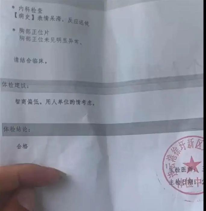 9月12日,有網友發布一則體(ti) 檢報告視頻,內(nei) 科檢查一欄寫(xie) 著“(病史)表情呆滯,反應遲鈍”字樣,而在體(ti) 檢建議一欄則寫(xie) 著“智商偏低。用人單位酌情考慮”的內(nei) 容,而在胸部拍片一欄則完全正常,最終的體(ti) 檢結論也是合格。