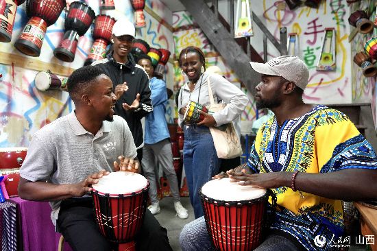 圖為(wei) 選手在非洲手鼓店一起表演。人民網 盧鵬宇攝