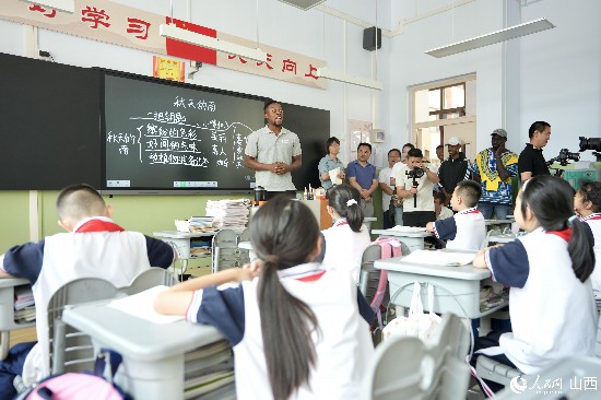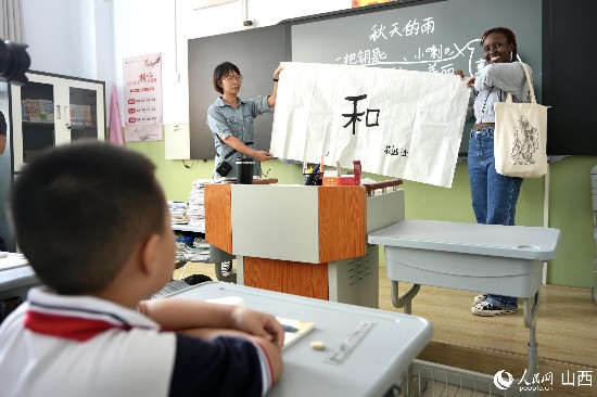 圖為(wei) 莉迪亞(ya) 給午亭小學三年級一班的同學贈送書(shu) 法禮物。人民網 盧鵬宇攝