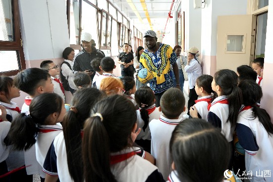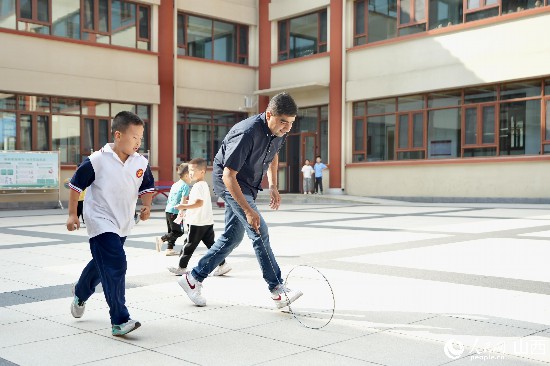 圖為(wei) 沙傑和午亭小學的學生一起玩滾鐵圈。人民網 盧鵬宇攝