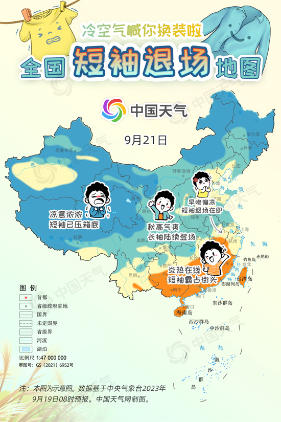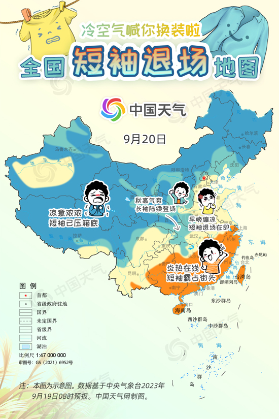 中國天氣網訊 進入9月中旬,冷空氣變“勞模”頻繁來襲,西北、東(dong) 北大部都已邁入秋天門檻,但華北一帶今年秋天似乎來得有點兒(er) 晚,南方地區白天甚至熱到還要開空調,不少網友喊話“秋高氣爽何時能來?”今起三天(9月19日至21日),受冷空氣和降雨共同影響,長江以北大部地區將陸續迎來降溫,開啟秋日初體(ti) 驗。中國天氣網特別推出全國短袖退場地圖,看看哪裏可以安排秋天的第一件長袖。