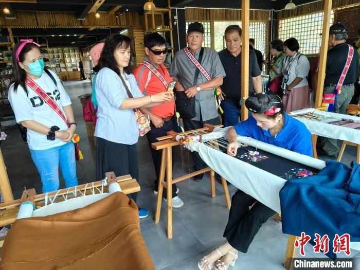 9月17日,來自台灣花蓮縣光複鄉(xiang) 的村民在貴州西江千戶苗寨參觀苗繡製作。 邱軼軻 攝