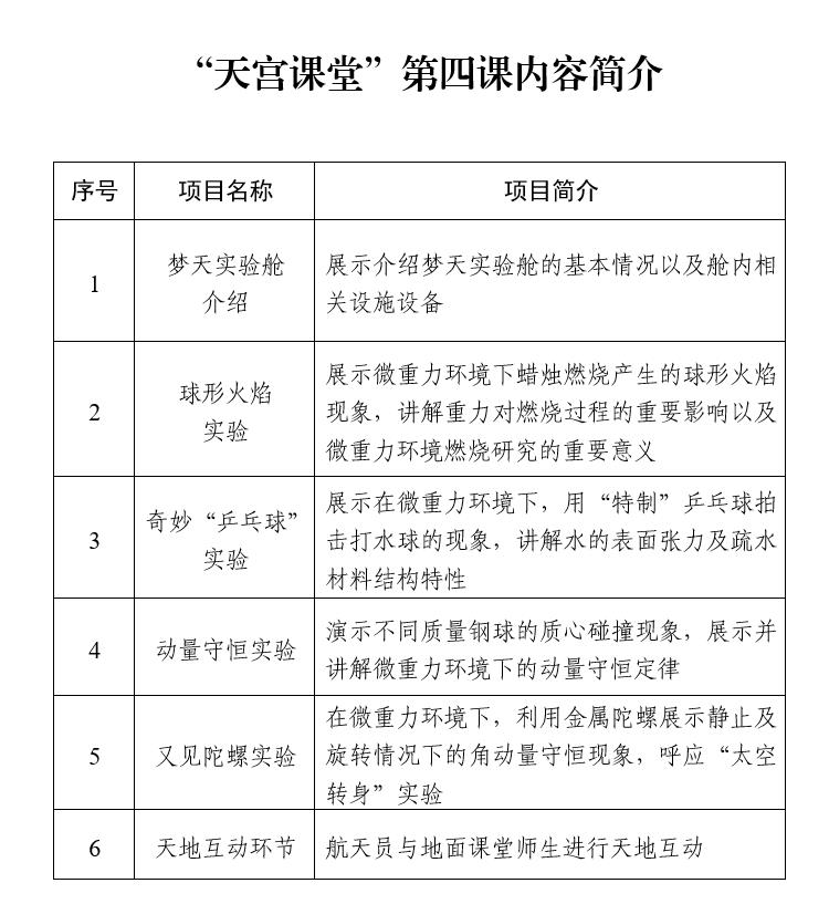 本次太空授課活動繼續采取天地互動方式進行。3名航天員將在軌展示介紹中國空間站夢天實驗艙工作生活場景,演示球形火焰實驗、奇妙“乒乓球”實驗、動量守恒實驗以及又見陀螺實驗,並與(yu) 地麵課堂進行互動交流。
