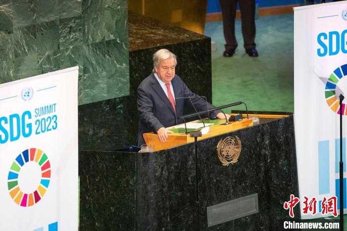 當地時間9月18日,聯合國可持續發展目標峰會(hui) 在紐約聯合國總部拉開帷幕。當天,聯大通過一項政治宣言,會(hui) 員國承諾加速實現2030年可持續發展目標。圖為(wei) 聯合國秘書(shu) 長古特雷斯發表講話。 中新社記者 王帆 攝