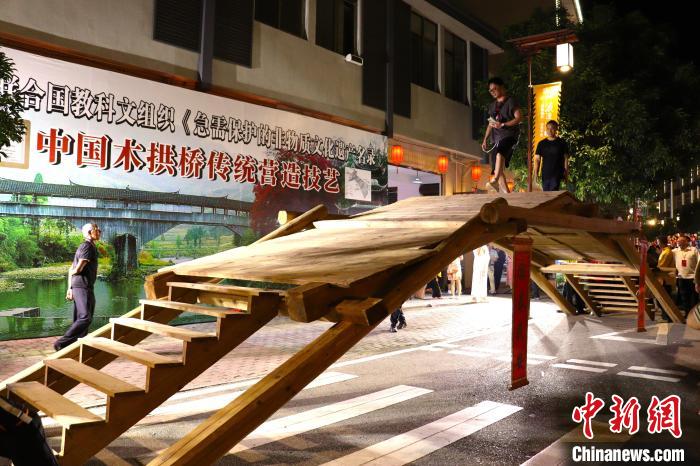 木拱廊橋傳(chuan) 統營造技藝展示現場,遊客登橋行走。中新網記者 葉茂 攝