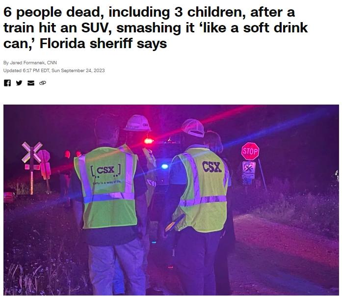 中新網9月25日電 據美國有線電視新聞網(CNN)24日報道,當地時間23日晚,美國佛羅裏達州希爾斯伯勒縣一列火車在經過鐵路口時與(yu) 一輛SUV汽車相撞,造成6人遇難,其中包括3名兒(er) 童。