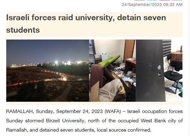 中新網9月24日電 據巴勒斯坦官方通訊社報道,當地時間24日,在約旦河西岸城市拉姆安拉以北,以軍(jun) 突襲巴勒斯坦比爾宰特大學,並逮捕了7名該大學學生。