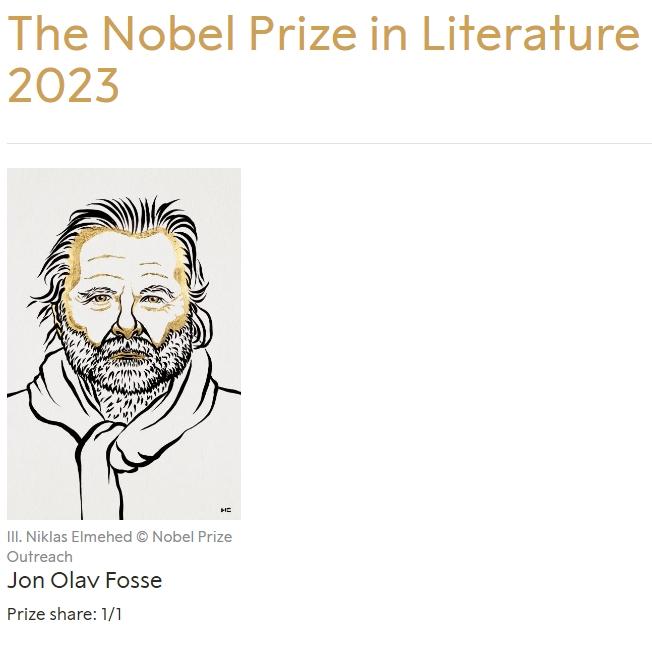 中新網10月5日電(張奧林)據諾貝爾獎官網消息,北京時間5日19時許,2023年諾貝爾文學獎揭曉,挪威作家約恩·福瑟(Jon Fosse)被授予該獎項。