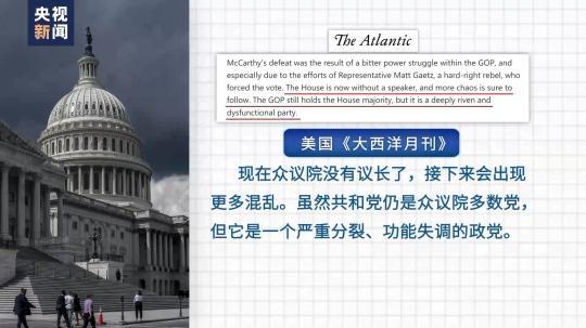 美國《大西洋月刊》評論說,現在眾(zhong) 議院沒有議長了,接下來會(hui) 出現更多混亂(luan) 。雖然共和黨(dang) 仍是眾(zhong) 議院多數黨(dang) ,但它是一個(ge) 嚴(yan) 重分裂、功能失調的政黨(dang) 。