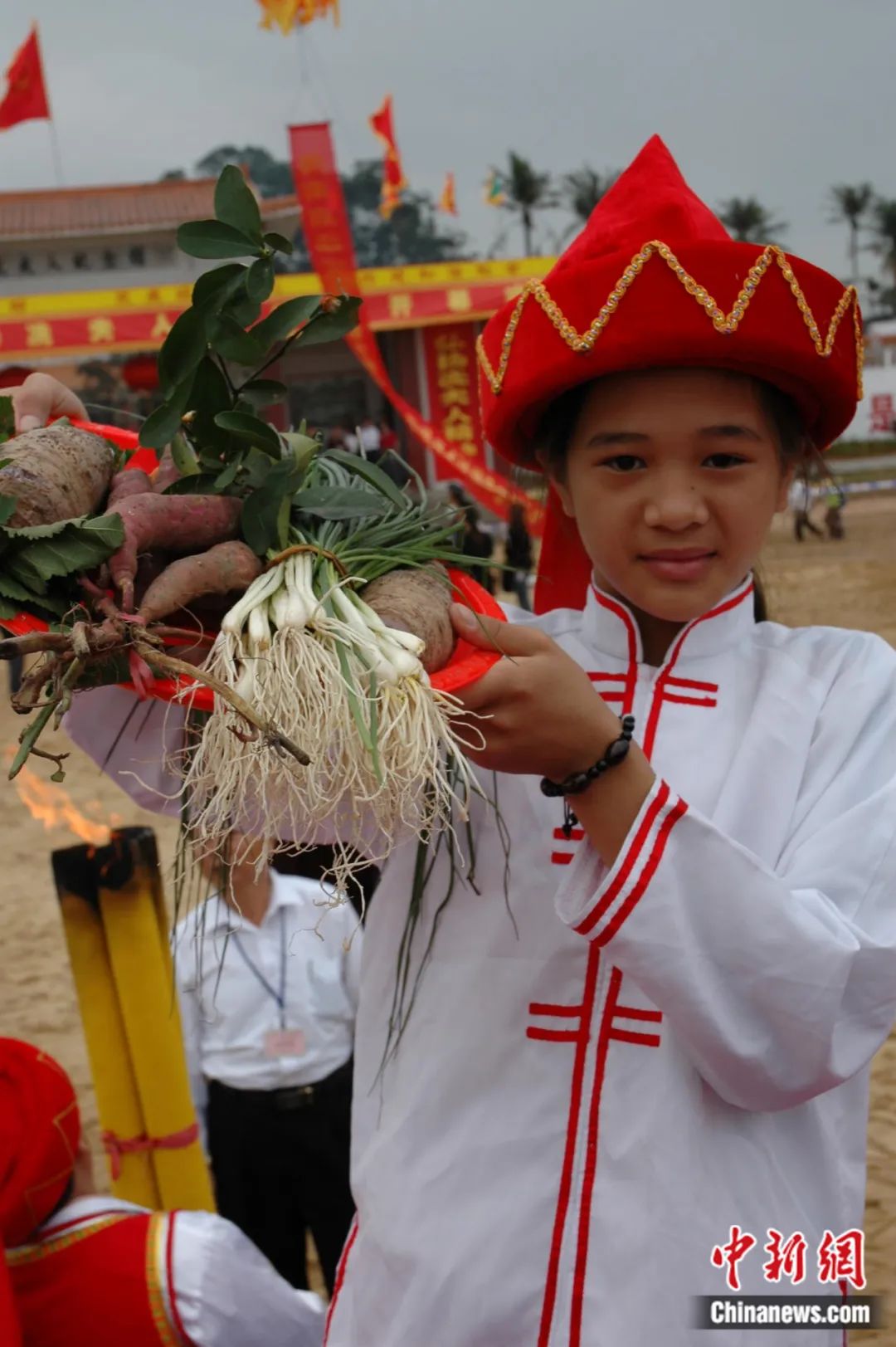 海口小姑娘用春蔥、地瓜和桑桔等農(nong) 家土特產(chan) 品祭祀“嶺南聖母”冼夫人。王辛莉 攝