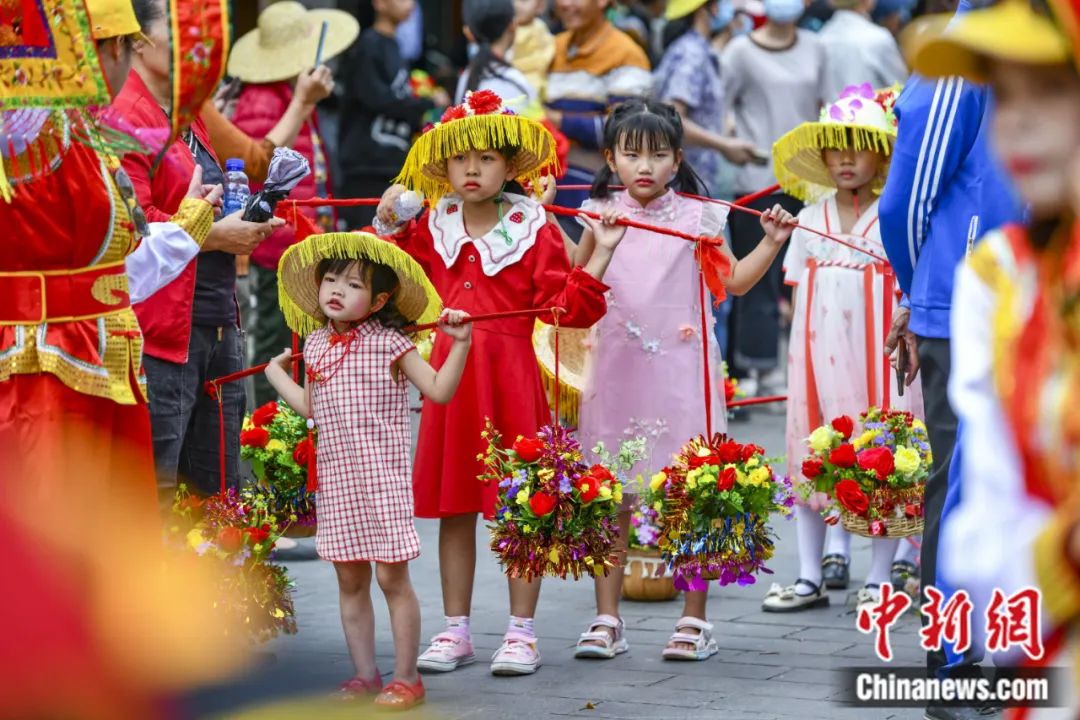 2023年2月28日,第二十二屆海口冼夫人文化節(原稱軍(jun) 坡節)之“裝軍(jun) 巡遊”活動在海南海口新坡鎮舉(ju) 行。圖為(wei) 在活動中肩挑花籃的小女孩。駱雲(yun) 飛 攝