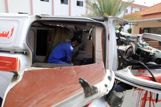 ↑這是10月7日在加沙地帶城市汗尤尼斯拍攝的在以色列空襲中受損的救護車。新華社發(哈立德·奧馬爾攝)