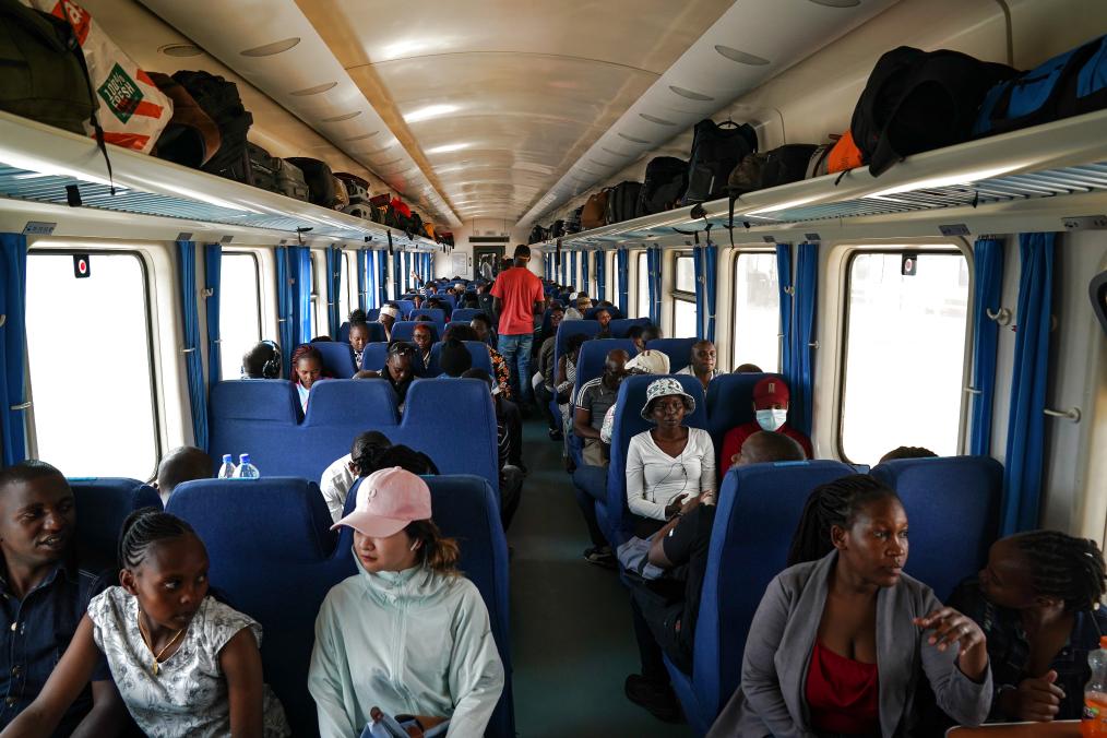 9月20日,在肯尼亞(ya) 蒙內(nei) 鐵路內(nei) 羅畢站,乘客坐在即將開往蒙巴薩的客運列車車廂內(nei) 。新華社記者韓旭攝