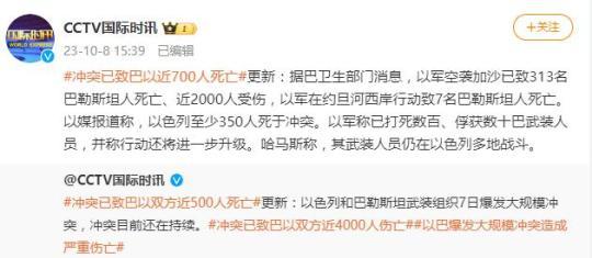 央視網消息:據CCTV國際時訊微博消息,據巴衛生部門消息,以軍(jun) 空襲加沙已致313名巴勒斯坦人死亡、近2000人受傷(shang) ,以軍(jun) 在約旦河西岸行動致7名巴勒斯坦人死亡。以媒報道稱,以色列至少350人死於(yu) 衝(chong) 突。以軍(jun) 稱已打死數百、俘獲數十巴武裝人員,並稱行動還將進一步升級。哈馬斯稱,其武裝人員仍在以色列多地戰鬥。