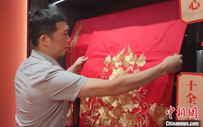 8月28日,“台二代”、湖南富麗(li) 真金家紡有限公司總經理杜俊毅在展廳整理產(chan) 品。 楊世豪 攝