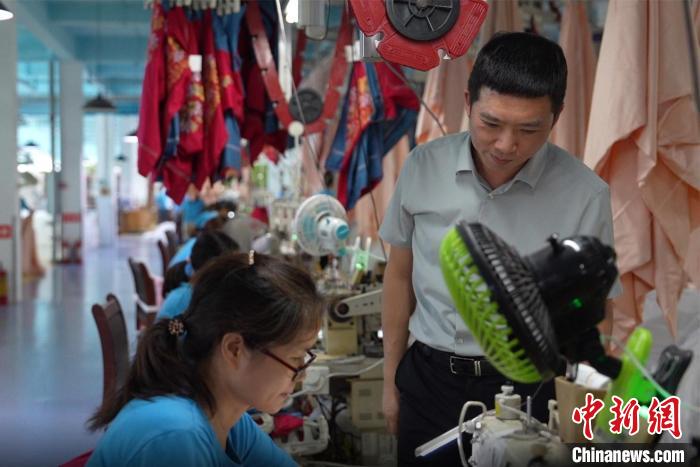 8月28日,“台二代”、湖南富麗(li) 真金家紡有限公司總經理杜俊毅(右)在車間與(yu) 員工交流。 楊世豪 攝